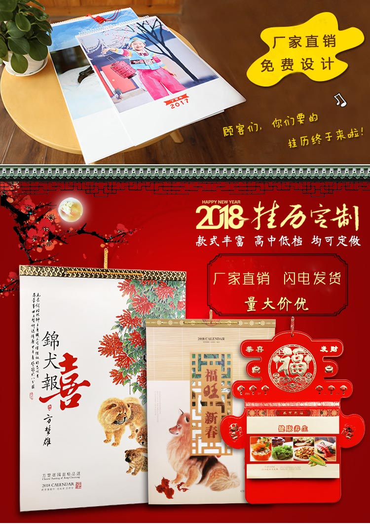 2018狗年福字吊歷掛歷定做印金